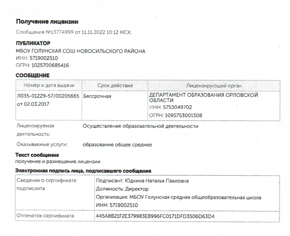 Юридический адрес образовательного учреждения: 303503 Орловская область, Новосильский район, с. Голунь, ул. Школьная, д.1